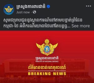 Cambodia-Thailand border regarding the Thai military forces continue their armed aggression to invade Cambodian sovereign territory in the 4th Military Region in the area of Koul 8, Sra’em commune, Choam Khsant district, Preah Vihear province, on December 23, 2025. – From 2:30pm to 3:10pm, the Thai military deployed fighter jets to drop 6 bombs in the area of Koul 8, Sra’em commune, Choam Khsant district, Preah Vihear province. Cambodian forces will continue to monitor the situation closely, and stand strong, brave, and steadfast in their fight against the aggressors and remain vigilant in fulfilling their roles to protect the territorial integrity of Cambodia. We will protect our dignity with courage and unwavering resolve, at any cost, and without succumbing to coercion or intimidation in any form. Further detailed information will be provided later as the situation develops. 🌐 គេហទំព័រ ក្រសួងការពារជាតិ 🌐 ក្រសួងការពារជាតិ 🌐 TEA Seiha/ទៀ សីហា 🌐 X(Twitter): ក្រសួងការពារជាតិ 🌐 YouTube: ក្រសួងការពារជាតិ 🌐 Tiktok: ក្រសួងការពារជាតិ