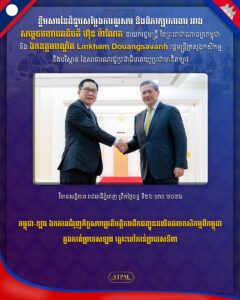 កម្ពុជា-ឡាវ ឯកភាពជំរុញកិច្ចសហប្រតិបត្តិការដឹកជញ្ជូនផលិតផលកសិកម្មពីកម្ពុជា ឆ្លងកាត់ប្រទេសឡាវ ឆ្ពោះទៅកាន់ប្រទេសទី៣ នាព្រឹកថ្ងៃទី២៦ ខែមករា ឆ្នាំ២០២៦, សម្តេចមហាបវរធិបតី ហ៊ុន ម៉ាណែត នាយករដ្ឋមន្ត្រីនៃព្រះរាជាណាចក្រកម្ពុជា បានអនុញ្ញាតឱ្យឯកឧត្តមបណ្ឌិត Linkham Douangsavanh រដ្ឋមន្ត្រីក្រសួងកសិកម្ម និងបរិស្ថាន នៃសាធារណរដ្ឋប្រជាធិបតេយ្យប្រជាមានិតឡាវ ចូលជួបសម្តែងការគួរសម និងពិភាក្សាការងារ នៅវិមានសន្តិភាព។ ក្នុងឱកាសនៃជំនួប, ឯកឧត្តមរដ្ឋមន្ត្រីក្រសួងកសិកម្ម និងបរិស្ថាន បានគោរពថ្លែងអំណរគុណយ៉ាងជ្រាលជ្រៅជូនចំពោះសម្ដេចបវរធិបតី ដែលបានអនុញ្ញាតឱ្យរូបឯកឧត្តម និងគណៈប្រតិភូ ចូលជួបសម្ដែងការគួរសម និងពិភាក្សាការងារ នាឱកាសនេះ។ ឯកឧត្តមរដ្ឋមន្ត្រី ក៏បានថ្លែងអំណរគុណក្រសួងកសិកម្ម រុក្ខាប្រមាញ់ និងនេសាទ កម្ពុជា ដែលបានផ្ដល់នូវការស្វាគមន៍យ៉ាងកក់ក្ដៅជូនចំពោះឯកឧត្តម និងគណៈប្រតិភូ ដែលនេះបង្ហាញអំពីការយកចិត្តទុកដាក់ខ្ពស់ចំពោះកិច្ចសហប្រតិបត្តិការកម្ពុជា-ឡាវ។ ឯកឧត្តមរដ្ឋមន្ត្រី បានគោរពជម្រាបជូនសម្ដេចបវរធិបតីថា ក្នុងរយៈពេល៧០ឆ្នាំ នៃការបង្កើតទំនាក់ទំនងការទូត កម្ពុជា-ឡាវ, កិច្ចសហប្រតិបត្តិការរវាងប្រទេសទាំងពីរមានការវិវត្តរីកចម្រើនឥតឈប់ឈរ ហើយដំណើរទស្សនកិច្ចរបស់គណៈប្រតិភូឡាវនៅកម្ពុជានាពេលនេះ ក៏ជាការចូលរួមអបអរសាទរខួបអនុស្សាវរីយ៍លើកទី៧០ នៃការបង្កើតទំនាក់ទំនងការទូតកម្ពុជា-ឡាវ ផងដែរ។ ឆ្លៀតក្នុងឱកាសនេះ, ឯកឧត្តមរដ្ឋមន្ត្រីក៏បានគូសបញ្ជាក់ជូនសម្ដេចបវរធិបតីថា ដំណើរទស្សនកិច្ចរបស់ឯកឧត្តម និងគណៈប្រតិភូ មកកាន់កម្ពុជានាឱកាសនេះ មានគោលបំណងសំខាន់ចំនួន ២ រួមមាន៖ (១) ការពិភាក្សាទៅលើការអនុវត្តនូវកិច្ចព្រមព្រៀងដែលប្រទេសទាំងពីរបានឯកភាពគ្នាកន្លងមក សំដៅជំរុញការបង្កបង្កើនផលិតផលកសិកម្ម, ការចិញ្ចឹមសត្វ, និងការអភិរក្សព្រៃឈើ និង (២) ការពិភាក្សាលើការជំរុញកិច្ចសហប្រតិបត្តិការនៅក្នុងការដឹកជញ្ជូនផលិតផលកសិកម្មពីកម្ពុជា ដោយឆ្លងកាត់ប្រទេសឡាវ ឆ្ពោះទៅកាន់ប្រទេសទី៣។ ឯកឧត្តមរដ្ឋមន្រ្តីក៏បានជម្រាបជូនសម្តេចបវរធិបតីថា ក្រសួងកសិកម្ម និងបរិស្ថានឡាវ និងក្រសួងកសិកម្ម រុក្ខាប្រមាញ់ និងនេសាទកម្ពុជា បានឯកភាពគ្នាលើកិច្ចសហប្រតិបត្តិការក្នុងការដឹកជញ្ជូនផលិតផលកសិកម្មពីកម្ពុជា ដោយឆ្លងកាត់ប្រទេសឡាវ ទៅកាន់ប្រទេសទី៣ ហើយឯកឧត្តមរដ្ឋមន្ត្រីក៏បានប្ដេជ្ញាចិត្តជំរុញកិច្ចសហប្រតិបត្តិការនេះសម្រេចបានលទ្ធផលជាផ្លែផ្កា និងឱ្យបានឆាប់រហ័ស។ បន្ថែមពីនេះ, ឯកឧត្តមរដ្ឋមន្ត្រីក៏បានប្ដេជ្ញានៅក្នុងការជំរុញ ពង្រឹង និងពង្រីកកិច្ចសហប្រតិបត្តិការលើវិស័យកសិកម្ម និងបរិស្ថា