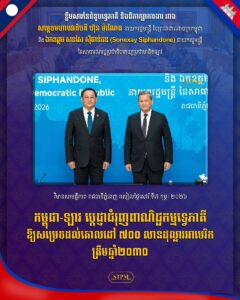 កម្ពុជា-ឡាវ ប្ដេជ្ញាជំរុញពាណិជ្ជកម្មទ្វេភាគីឱ្យសម្រេចដល់គោលដៅ ៧០០ លានដុល្លារអាមេរិក ត្រឹមឆ្នាំ២០៣០ នារសៀលថ្ងៃទី០៧ ខែកុម្ភៈ ឆ្នាំ២០២៦, សម្តេចមហាបវរធិបតី ហ៊ុន ម៉ាណែត នាយករដ្ឋមន្រ្តី នៃព្រះរាជាណាចក្រកម្ពុជា បានទទួលជួបពិភាក្សាការងារជាមួយ ឯកឧត្តម សនសៃ ស៊ីផាន់ដន (Sonexay Siphandone) នាយករដ្ឋមន្រ្តីនៃសាធារណរដ្ឋប្រជាធិបតេយ្យប្រជាមានិតឡាវ នៅវិមានសាមគ្គីភាព ក្នុងឱកាសដែលឯកឧត្តមនាយករដ្ឋមន្ត្រីឡាវអញ្ជើញចូលរួមកិច្ចប្រជុំរវាងថ្នាក់ដឹកនាំកំពូលគណបក្សប្រជាជនកម្ពុជា, ថ្នាក់ដឹកនាំកំពូលគណបក្សកុម្មុយនីស្តវៀតណាម និងថ្នាក់ដឹកនាំកំពូលគណបក្សប្រជាជនបដិវត្តន៍ឡាវ នៅរាជធានីភ្នំពេញ ព្រះរាជាណាចក្រកម្ពុជា ពីថ្ងៃទី៦ដល់ថ្ងៃទី៧ ខែកុម្ភៈ ឆ្នាំ២០២៦។ ក្នុងកិច្ចសហប្រតិបត្តិការទ្វេភាគី, នាយករដ្ឋមន្រ្តីទាំងពីរ បានវាយតម្លៃខ្ពស់ចំពោះការរីកចម្រើននៃទំនាក់ទំនងក្នុងគ្រប់កម្រិតនាពេលកន្លងមក ស្របតាមភាពជាដៃគូយុទ្ធសាស្ត្រគ្រប់ជ្រុងជ្រោយ និងយូរអង្វែង និងបានជំរុញឱ្យក្រសួងស្ថាប័នពាក់ព័ន្ធនៃប្រទេសទាំងពីរបន្តធ្វើការឱ្យបានជិតស្និទ្ធ ដើម្បីសម្រេចបានលទ្ធផលជាក់ស្តែង ជូនប្រជាជននៃប្រទេសទាំងពីរ។ ឆ្នាំ២០២៦ នេះ គឺជាឆ្នាំពិសេស នៃខួបអនុស្សាវរីយ៍លើកទី៧០ នៃការបង្កើតទំនាក់ទំនងការទូតរវាងប្រទេសទាំងពីរ, ប្រមុខរដ្ឋាភិបាលទាំងពីរ បានឯកភាពរួមគ្នារៀបចំសកម្មភាពឱ្យបានច្រើន ជំរុញការផ្លាស់ប្ដូរដំណើរទស្សនកិច្ចកម្រិតខ្ពស់ ដើម្បីអបអរសាទរឆ្នាំដ៏សំខាន់នេះ។ ជាក់ស្ដែង, ការអញ្ជើញធ្វើទស្សនកិច្ចផ្លូវរដ្ឋនៅកម្ពុជារបស់ ឯកឧត្តមបណ្ឌិត ថងលុន ស៊ីសុលីត អគ្គលេខាធិការបក្សប្រជាជនបដិវត្តន៍ឡាវ និងជាប្រធានរដ្ឋឡាវ នាឱកាសនេះ ក៏ដូចជាគម្រោងយាងបំពេញព្រះរាជទស្សកិច្ចផ្លូវរដ្ឋទៅកាន់រដ្ឋធានីវៀងចន្ទន៍នៃប្រទេសឡាវ របស់ព្រះករុណាព្រះបាទសម្តេចព្រះបរមនាថ នរោត្តម សីហមុនី ព្រះមហាក្សត្រនៃព្រះរាជាណាចក្រកម្ពុជា ក្នុងឆ្នាំ២០២៦ នេះ គឺជាសក្ខីភាពជាក់ស្ដែងក្នុងការបន្តពង្រឹង និងពង្រីកទំនាក់ទំនងនយោបាយ ការទូតរវាងប្រទេសទាំងពីរ។ នាយករដ្ឋមន្រ្តីទាំងពីរ ក៏បានពិភាក្សាផ្លាស់ប្ដូរយោបល់គ្នាអំពីយន្តការនៃការពង្រឹង និងពង្រីកកិច្ចសហប្រតិបត្តិការទ្វេភាគីឱ្យកាន់តែរីកចម្រើនបន្ថែមទៀត ជាពិសេសលើ៖ នយោបាយ-ការទូត, សេដ្ឋកិច្ច ពាណិជ្ជកម្ម និងវិនិយោគ, ធនាគារ, កសិកម្ម, ថាមពល, ការតភ្ជាប់រវាងប្រជាជន និងប្រជាជន, ការតភ្ជាប់ហេដ្ឋារចនាសម្ព័ន្ធដឹកជញ្ជូន, កិច្ចការព្រំដែន, ការពារជាតិ និងសន្តិសុខ, ការប្រយុទ្ធប្រឆាំងនឹងឧក្រិដ្ឋកម្មឆ្លងដែន, ការជួញដូរមនុស្ស និងការឆបោកតាមប្រព័ន្ធបច្ចេកវិទ្យា និងការប្រែក្លាយតំបន់ព្រំ