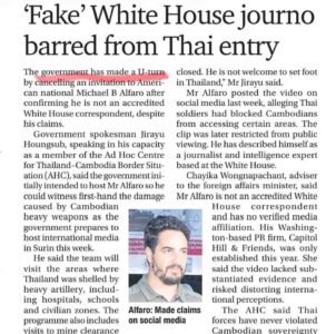 ☆ពត៌មានបន្ទាន់ ចម្លែក ! ~ក្រឡាស់សំដីណាស់ បាតដៃខ្នងដៃ ! ក្រោយចោទប្រកាន់លោកMichel Alfaro ជាបុគ្គលដែលកម្ពុជាជួលឱ្យផ្សាយព័ត៌មានមិនពិតពីថៃ អ្នកនាំពាក្យរដ្ឋាភិបាលថៃ លោកJirayu Huang Sap ប្រកាសហៅលោកAlfaro ឱ្យមកផ្សាយពីថៃម្តង ។ ប៉ុន្តែការប្រកាសនេះមិនបានមួយថ្ងៃផង បន្ទាប់ពីលោក Michel Alfaro យល់ព្រមទៅតាមសំណើរ បែរជា អ្នកនាំពាក្យរដ្ឋាភិបាលថៃរូបនេះ បដិសេធមិនឲ្យ លោកMichel Alfaro ទៅជាន់ដីថៃទៅវិញ . .ការនិយាយមិនពិតរបស់អ្នកនាំពាក្យរដ្ឋាភិបាលថៃរូបនេះត្រូវបានអ្នកសារព័ត៌មានថៃដ៏ល្បីឈ្មោះ លោក Pravit Rojanaphruk និយាយថា ៖《 រឿងនេះមិនមែនគ្រាន់តែជាកំហុសឆ្គងមួយផ្នែករបស់អ្នកនាំពាក្យរដ្ឋាភិបាលថៃ លោកJirayu Huangsap ទេ តែវាក៏ធ្វើឲ្យប្រទេសថៃអាមាស់ បាក់មុខ ព្រោះអ្នកនាំពាក្យរដ្ឋាភិបាលត្រូវបានគេចោទថា ក្រឡេចក្រឡុច មិនអាចយកជាការបាន 》ឬ ” គេអាចនិយាយថា÷ Don’t Thai to me ” ពិតជាឆោតល្ងង់មែន ! Peter Lee