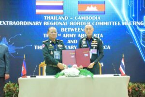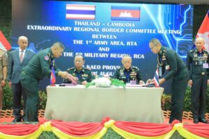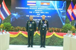 គណៈប្រតិភូកម្ពុជា ដឹកនាំដោយ ឧត្តមសេនីយ៍ឯក ឯក សំអូន មេបញ្ជាការយោធភូមិភាគទី៥ និងជាសហប្រធាននៃកិច្ចប្រជុំវិសាមញ្ញរបស់គណៈកម្មាធិការព្រំដែនថ្នាក់យោធភូមិភាគ (RBC) ។ គណៈប្រតិភូថៃ ដឹកនាំដោយ ឧត្តមសេនីយ៍ឯក Amarit Boonsuya មេបញ្ជាការ កងទ័ពភូមិភាគទី១ និងជាសហប្រធាននៃកិច្ចប្រជុំវិសាមញ្ញរបស់គណៈកម្មាធិការព្រំដែនថ្នាក់យោធភូមិភាគ (RBC) ។ កិច្ចប្រជុំវិសាមញ្ញរបស់គណៈកម្មាធិការព្រំដែនថ្នាក់យោធភូមិភាគកម្ពុជា-ថៃ (RBC) បានបញ្ចប់ដោយជោគជ័យនៅវេលាម៉ោង១១:១៥នាទីព្រឹកថ្ងៃដដែល ដោយភាគីកម្ពុជា និងថៃបានបញ្ជាក់ពីការប្តេជ្ញាចិត្តយ៉ាងមុតមាំ ក្នុងការអនុវត្តបទឈប់បាញ់ និងគោលការណ៍ឯកភាពទាំង១៣ចំណុច ការពង្រឹងបន្ថែមទៀតនូវទំនាក់ទំនងទ្វេភាគី និងការស្តារប្រក្រតីភាពឡើងវិញនៅតាមតំបន់ព្រំដែន។ ភាគីទាំងពីរក៏បានឯកភាពគ្នាក្នុងការរៀបចំកិច្ចប្រជុំបន្ទាប់របស់គណៈកម្មាធិការកិច្ចការព្រំដែនថ្នាក់យោធភូមិភាគ (RBC) ក្នុងរយៈពេលមួយខែក្រោយកិច្ចប្រជុំវិសាមញ្ញនេះ ឬតាមពេលវេលាសមស្រប ដោយប្រទេសកម្ពុជាធ្វើជាម្ចាស់ផ្ទះ។ អាស្រ័យដូចបានជម្រាបជូនខាងលើ សូមសាធារណជន និងអ្នកសារព័ត៌មានជាតិនិងអន្តរជាតិជ្រាបជាព័ត៌មាន៕ ថ្ងៃសុក្រ ១៣រោច ខែស្រាពណ៏ ឆ្នាំម្សាញ់ សប្តស័ក ព.ស.២៥៦៩ ត្រូវនឹងថៃ្ងទី២២ ខែសីហា ឆ្នាំ២០២៥ សារព័ត៌មានព្រហ្មមានជ័យ ដកស្រង់ចេញពី ក្រសួងការពារជាតិ