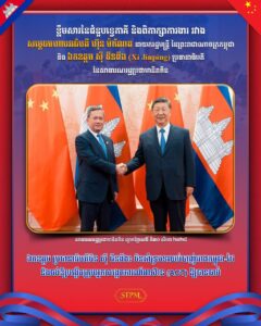 ឯកឧត្តម ប្រធានាធិបតីចិន ស៊ី ជីនពីង៖ ចិនគាំទ្របទឈប់បាញ់រវាងកម្ពុជា-ថៃ និងចង់ឱ្យបង្កើតក្រុមអ្នកសង្កេតការណ៍អាស៊ាន (AOT) ឱ្យបានឆាប់ នៅរសៀលថ្ងៃទី៣០ ខែសីហា ឆ្នាំ២០២៥ សម្តេចមហាបវរធិបតី ហ៊ុន ម៉ាណែត នាយករដ្ឋមន្ត្រីនៃព្រះរាជាណាចក្រកម្ពុជា បានដឹកនាំគណៈប្រតិភូជួបប្រជុំការងារទ្វេភាគីជាមួយឯកឧត្តម ស៊ី ជីនពីង ប្រធានាធិបតីនៃសាធារណរដ្ឋប្រជាមានិតចិន ក្នុងឱកាសនៃការចូលរួមកិច្ចប្រជុំកំពូល នៃអង្គការសហប្រតិបត្តិការសៀងហៃ បូក ពីថ្ងៃទី៣០ ខែសីហា ដល់ថ្ងៃទី០១ ខែកញ្ញា ឆ្នាំ២០២៥ នៅទីក្រុងធានជីង សាធារណរដ្ឋប្រជាមានិតចិន។ ក្នុងឱកាសនៃជំនួប ឯកឧត្តមប្រធានាធិបតី បានសម្តែងការស្វាគមន៍ប្រកបដោយមនោសញ្ចេតនាយ៉ាងជ្រាលជ្រៅបំផុត ជូនចំពោះ សម្តេចបវរធិបតី និងគណៈប្រតិភូរាជរដ្ឋាភិបាលកម្ពុជា ដែលបានឆ្លៀតឱកាសដ៏មមាញឹក អញ្ជើញចូលរួមកិច្ចប្រជុំកំពូលនៃអង្គការសហប្រតិបត្តិការសៀងហៃ បូក នៅសាធារណរដ្ឋប្រជាមានិតចិននាពេលនេះ។ ឯកឧត្តមប្រធានាធិបតីបានចាត់ទុកវត្តមានរបស់សម្តេចបវរធិបតី គឺជាកាលានុវត្តភាពដ៏សំខាន់ ដើម្បីបន្តរឹតចំណងមិត្តភាពដែកថែប និងពង្រីកសាមគ្គីភាព ចិន-កម្ពុជា ឱ្យកាន់តែរឹងមាំថែមទៀត បន្ទាប់ពីទស្សនកិច្ចផ្លូវរដ្ឋរបស់ឯកឧត្តម កាលពីខែមេសា កន្លងទៅ។ ពាក់ព័ន្ធនឹងស្ថានភាពនៅតាមព្រំដែនកម្ពុជា-ថៃ, ឯកឧត្តម ស៊ី ជីនពីង បានបញ្ជាក់ជាថ្មីពីជំហររបស់ចិនក្នុងការគាំទ្របទឈប់បាញ់, គាំទ្រយន្តការសង្កេតការណ៍បទឈប់បាញ់របស់អាស៊ានដែលដឹកនាំដោយម៉ាឡេស៊ី និងចង់ឱ្យបង្កើតក្រុមអ្នកសង្កេតការណ៍អាស៊ាន (AOT) ឱ្យបានឆាប់។ ទន្ទឹមនឹងនេះ ឯកឧត្តមប្រធានាធិបតីក៏បានគាំទ្រ និងផ្តល់ជំនួយមនុស្សធម៌ដល់កម្ពុជា ដើម្បីជួយស្តារឡើងវិញនូវការខូចខាត និងជួយសម្រួលដល់ទុក្ខលំបាករបស់ប្រជាពលរដ្ឋដែលរងគ្រោះពីការប៉ះទង្គិចប្រដាប់អាវុធកាលពីចុងខែកក្កដាកន្លងទៅ។ ជាការឆ្លើយតប, សម្តេចបវរធិបតី បានថ្លែងអំណរគុណយ៉ាងជ្រាលជ្រៅបំផុតជូនចំពោះរដ្ឋាភិបាល និងប្រជាជនចិន ដែលតែងតែជួយគាំទ្រដល់ការអភិវឌ្ឍលើគ្រប់វិស័យរបស់កម្ពុជា។ សម្តេចបានគូសបញ្ជាក់ថា ការគាំទ្ររបស់មិត្តចិន គឺជាកម្លាំងចលករដ៏សំខាន់ក្នុងការជំរុញការអភិវឌ្ឍសង្គម-សេដ្ឋកិច្ច, ការកសាងហេដ្ឋារចនាសម្ព័ន្ធ និងការលើកកម្ពស់ជីវភាពប្រជាពលរដ្ឋកម្ពុជា។ សម្តេចបវរធិបតីក៏បានថ្លែងអំណរគុណចំពោះការចូលរួមយ៉ាងសកម្មរបស់មិត្តចិន ក្នុងការសម្របសម្រួលឱ្យមានបទឈប់បាញ់រវាងកម្ពុជា និងថៃ បានយ៉ាងឆាប់រហ័ស ដែលជាជំហានឈានទៅរកការការពារអាយុជីវិតប្រជាពលរដ្ឋ និងជួយស្តារជីវភាពរបស់ប្រជាជនដែលរងផលប៉ះពាល់។មុននឹងបញ្ចប់, ថ្នាក់ដឹកនាំទាំងពីរបានផ្លាស់ប្ដូរយោបល់អំពីការពង្រឹង និ