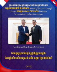 ឯកអគ្គរដ្ឋទូតបារាំងថ្មី ប្ដេជ្ញាជំរុញការពង្រឹង និងពង្រីកទំនាក់ទំនងទ្វេភាគី បារាំង-កម្ពុជា ឱ្យកាន់តែរឹងមាំ នាព្រឹកថ្ងៃទី១៩ ខែកញ្ញា ឆ្នាំ២០២៥,សម្ដេចមហាបវរធិបតី ហ៊ុន ម៉ាណែត នាយករដ្ឋមន្ត្រីនៃព្រះរាជាណាចក្រកម្ពុជា បានទទួលឯកឧត្តម Olivier RICHARD ឯកអគ្គរដ្ឋទូតវិសាមញ្ញ និងពេញសមត្ថភាពនៃសាធារណរដ្ឋបារាំង ប្រចាំព្រះរាជាណាចក្រកម្ពុជា ចូលសម្តែងការគួរសម និងពិភាក្សាការងារ នៅវិមានសន្តិភាព។ ក្នុងឱកាសនៃជំនួប, ឯកឧត្តមឯកអគ្គរដ្ឋទូតបានគោរពថ្លែងអំណរគុណយ៉ាងជ្រាលជ្រៅចំពោះសម្តេចបវរធិបតី ដែលបានចំណាយពេលវេលាដ៏មមាញឹកអនុញ្ញាតឱ្យរូបឯកឧត្តម និងសហការីចូលជួបសម្តែងការគួរសម និង ពិភាក្សាការងារ។ ឯកឧត្តមឯកអគ្គរដ្ឋទូតបានគូសបញ្ជាក់ថា បារាំង និងកម្ពុជាគឺជាដៃគូដ៏យូរអង្វែង ហើយទំនាក់ទំនង និងកិច្ចសហប្រតិបត្តិការនេះត្រូវបានពង្រឹង និងពង្រីកជាបន្តបន្ទាប់ និង ប្រកបដោយភាពរឹងមាំ។ ជាមួយគ្នានេះ, ឯកឧត្តមបានគូសបញ្ជាក់ពីការប្ដេជ្ញាចិត្តក្នុងការធ្វើការយ៉ាងជិតស្និទ្ធជាមួយក្រសួង-ស្ថាប័នកម្ពុជា ដើម្បីបន្តជំរុញ និងលើកកម្ពស់ទំនាក់ទំនង ក៏ដូចជាកិច្ចសហប្រតិបត្តិការ ទ្វេភាគី ឱ្យកាន់តែខ្លាំងក្លា, រីកចម្រើន និង រឹងមាំថែមទៀត។ ជាការឆ្លើយតប, សម្ដេចបវរធិបតីបានសម្តែងការស្វាគមន៍យ៉ាងកក់ក្តៅ និងអបអរសាទរចំពោះឯកឧត្តម Olivier RICHARD ដែលត្រូវបានតែងតាំងជាឯកអគ្គរដ្ឋទូតបារាំងថ្មីប្រចាំកម្ពុជា។ សម្ដេចបវរធិបតីបានបង្ហាញជំនឿជឿជាក់ថា បេសកកម្មការទូតរបស់ឯកឧត្តមនឹងក្លាយជាកម្លាំងចលករបន្ថែមទៀតក្នុងការរឹតចំណង និងពង្រឹងទំនាក់ទំនង និងមិត្តភាព ព្រមទាំង កិច្ចសហប្រតិបត្តិការទ្វេភាគី ទាំងក្នុងក្របខណ្ឌនៃទំនាក់ទំនងរវាងរដ្ឋាភិបាល និងរដ្ឋាភិបាល, ប្រជាជន និងប្រជាជន រួមទាំងវិស័យឯកជន និង វិស័យ ឯកជន ។ សម្ដេចបវរធិបតីបានបន្ថែមថា វឌ្ឍនភាពនៃទំនាក់ទំនងកម្ពុជា-បារាំង ជាកាលានុវត្តភាពសម្រាប់កិច្ចសហប្រតិបត្តិការលើវិស័យសក្តានុពលជាច្រើន និងបានបើកឱកាសបន្ថែមជាច្រើនទៀត សម្រាប់ប្រទេសទាំងពីរ។ សម្ដេចបវរធិបតី និងឯកឧត្តមឯកអគ្គរដ្ឋទូត បានពិភាក្សា និងឯកភាពគ្នាបន្តជំរុញការពង្រឹង និងពង្រីកកិច្ចសហប្រតិបត្តិការរវាងប្រទេសទាំងពីរ លើវិស័យសំខាន់ៗរួមមានជាអាទិ៍៖ សេដ្ឋកិច្ច, ពាណិជ្ជកម្ម និងវិនិយោគ, អប់រំ, សុខាភិបាល, ថាមពល, វប្បធម៌ និងបរិស្ថាន៕ ចំពោះបញ្ហាព្រំដែនកម្ពុជា-ថៃ, សម្ដេចបវរធិបតីបានថ្លែងអំណរគុណដល់ប្រធានាធិបតីបារាំង ឯកឧត្តម Emmanuel Macron ដែលបានគាំទ្រដល់បទឈប់បាញ់កន្លងមក និងបានជម្រាបជូនឯកឧត្តមអគ្គរដ្ឋទូតអំពីបច្ចុប្បន្នភាពស្តីពីការវិវឌ្ឍនៃស្ថានភាពព្រំដែនកម្ពុជា-ថៃ ព្រមទាំងបានគូសបញ្ជាក់ពីជំហររបស់កម