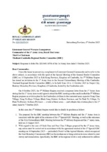 The Ministry of National Defence of the Kingdom of Cambodia would like to inform the general public, national and international media outlets, that: On Saturday, October 4, 2025, the 5th Military Region of the Royal Cambodian Army, Royal Cambodian Armed Forces issued a letter in response to the letter of the 1st Army Area of the Royal Thai Army dated October 3, 2025, as follows: 🌐 គេហទំព័រ ក្រសួងការពារជាតិ 🌐 ក្រសួងការពារជាតិ 🌐 TEA Seiha/ទៀ សីហា 🌐 X(Twitter): ក្រសួងការពារជាតិ 🌐 YouTube: ក្រសួងការពារជាតិ 🌐 Tiktok: ក្រសួងការពារជាតិ