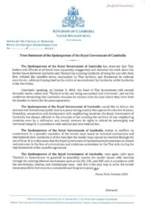 សេចក្តីថ្លែងការណ៍របស់អ្នកនាំពាក្យរាជរដ្ឋាភិបាលកម្ពុជា អ្នកនាំពាក្យរាជរដ្ឋាភិបាលកម្ពុជា សូមបញ្ជាក់ជូនសារជាថ្មីថារាជរដ្ឋាភិបាលកម្ពុជានៅតែរក្សាជំហរដោះស្រាយបញ្ហាព្រំដែនដោយសន្តិវិធីដោយឈរលើយន្តការបច្ចេកទេសនិងច្បាប់អន្តរជាតិ ហើយចាត់ទុកថាការប្រើប្រាស់កម្លាំងយោធាមិនអាចដោះស្រាយបញ្ហាព្រំដែនបានឡើយ។ ក្នុងន័យនេះហើយ ដែលរាជរដ្ឋាភិបាលកម្ពុជាតែងតែប្រកាន់យកនូវការអត់ធ្មត់កម្រិតខ្ពស់បំផុតនៅចំពោះមុខសកម្មភាពរំលោភបំពាននានា ដែលភាគីថៃបាននិងកំពុងបង្កឡើងនៅក្នុងអំឡុងពេលនៃការអនុវត្តបទឈប់បាញ់។ The Spokesperson of the Royal Government of Cambodia wishes to reaffirm its commitment to a peaceful resolution of the border issue based on technical mechanisms and international laws. Cambodia is of the view that the border issue cannot be resolved through the use of force. It is in this sense that the Royal Government of Cambodia strictly exercises its utmost restraint even in the face of provocations and violations undertaken by the Thai side during the implementation of the ceasefire agreement.
