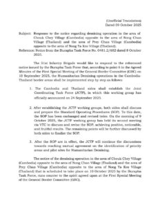 The Ministry of National Defence of the Kingdom of Cambodia wishes to inform the public, both domestic and international media outlets, of the following: On Thursday, October 9, 2025, the 51st Infantry Brigade of the Royal Cambodian Armed Forces’ 5th Military Region issued a letter in response to a demining notification issued by the Burapha Task Force of the Thai 1st Army Area. This notification concerned the demining of the Chok Chey Village area (Cambodia) opposite the Nong Chan Village area (Thailand), and the Prey Chan Village area (Cambodia) opposite the Nong Ya Kaeo Village area (Thailand). The content of the response is as follows: