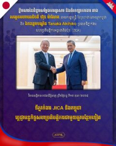 ទីភ្នាក់ងារ JICA និងកម្ពុជា ប្តេជ្ញាបន្តកិច្ចសហប្រតិបត្តិការជាមួយគ្នាបន្ថែមទៀត នាព្រឹកថ្ងៃទី១៣ ខែតុលា ឆ្នាំ២០២៥ នៅវិមានសន្តិភាព, សម្តេចមហាបវរធិបតី ហ៊ុន ម៉ាណែត នាយករដ្ឋមន្ត្រីនៃព្រះរាជាណាចក្រកម្ពុជា បានអនុញ្ញាតឱ្យ ឯកឧត្តមបណ្ឌិត Tanaka Akihiko ប្រធានទីភ្នាក់ងារសហប្រតិបត្តិការអន្តរជាតិជប៉ុន (JICA) ចូលជួបសម្តែងការគួរសម និងពិភាក្សាការងារ។ ក្នុងឱកាសនៃជំនួប, ឯកឧត្តមបណ្ឌិត Tanaka Akihiko បានកត់សម្គាល់ការរីកចម្រើនយ៉ាងច្រើនរបស់កម្ពុជា ព្រោះឯកឧត្តមបណ្ឌិតធ្លាប់បានបំពេញទស្សនកិច្ចការងារនៅកម្ពុជា កាលពី១០ឆ្នាំមុន ។ ឯកឧត្តមបណ្ឌិតបានគូសបញ្ជាក់អំពីការបន្តគាំទ្ររបស់ទីភ្នាក់ងារ JICA ចំពោះកិច្ចសហប្រតិបត្តិការជាច្រើន មានជាអាទិ៍៖ ការបោសសម្អាតមីន, និងការពង្រីកកំពង់ផែស្វយ័តក្រុងព្រះសីហនុ។ ឯកឧត្តមបណ្ឌិតបានវាយតម្លៃខ្ពស់ចំពោះអង្គភាព CMAC របស់កម្ពុជា ដែលបានផ្តល់វគ្គបណ្តុះបណ្តាលបោសសម្អាតមីនមនុស្សធម៌ ដល់អង្គភាពផ្តល់សេវាកម្មរដ្ឋក្នុងគ្រាអាសន្នរបស់ប្រទេសអ៊ុយក្រែន។ ឯកឧត្តមបណ្ឌិតបានថ្លែងបន្ថែមអំពីការផ្តល់ឥណទានសម្បទានរបស់រដ្ឋាភិបាលជប៉ុន ក្រោមជំនួយអភិវឌ្ឍន៍ផ្លូវការ (ODA) ដើម្បីពង្រីកប្រព័ន្ធផ្គត់ផ្គង់ទឹកស្អាតនិរោធ និងគម្រោងពង្រីកប្រព័ន្ធបញ្ជូន និងចែកចាយអគ្គិសនីក្នុងរាជធានីភ្នំពេញ (ដំណាក់កាលទី៣) ដោយគម្រោងទាំងនេះនឹងត្រូវចុះហត្ថលេខានារសៀលថ្ងៃនេះ។ ជាការឆ្លើយតប, សម្តេចបវរធិបតីបានសម្តែងការពេញចិត្តចំពោះវឌ្ឍនភាពនៃទំនាក់ទំនង និងកិច្ចសហប្រតិបត្តិការកម្ពុជា-ជប៉ុន និងបានវាយតម្លៃខ្ពស់ចំពោះការចូលរួមរបស់ជប៉ុន ក្នុងការកសាងសុខសន្តិភាពនៅកម្ពុជា ក៏ដូចជាការអភិវឌ្ឍសង្គម-សេដ្ឋកិច្ចកម្ពុជា រហូតមកដល់សព្វថ្ងៃនេះ។ សម្តេចបវរធិបតី បានគូសបញ្ជាក់ថា ទំនាក់ទំនងកម្ពុជា និងជប៉ុន បានឈានដល់កម្រិតដៃគូយុទ្ធសាស្ត្រគ្រប់ជ្រុងជ្រោយ និងជឿជាក់ថា កិច្ចសហប្រតិបត្តិការកម្ពុជា-ជប៉ុននឹងត្រូវបានជំរុញនិងពង្រឹងឱ្យកាន់តែស៊ីជម្រៅ និងរឹងមាំថែមទៀត។ សម្តេចបវរធិបតីបានសម្តែងនូវការគាំទ្រ និងថ្លែងអំណរគុណចំពោះទីភ្នាក់ងារ JICA ដែលបានរួមចំណែកគាំទ្រដល់មូលដ្ឋានគ្រឹះនៃការអភិវឌ្ឍសេដ្ឋកិច្ចរបស់កម្ពុជា ដូចជា ការបោសសម្អាតមីន ការបណ្តុះបណ្តាលធនធានមនុស្ស និង ការអភិវឌ្ឍហេដ្ឋារចនាសម្ព័ន្ធ ជាដើម។ សម្តេចបវរធិបតីបានចែករំលែកអំពីចក្ខុវិស័យរបស់កម្ពុជា ក្នុងការអភិវឌ្ឍតំបន់ឆ្នេរសមុទ្ររបស់កម្ពុជា រួមទាំងការប្រែក្លាយខេត្តព្រះសីហនុ ជាតំបន់ឧស្សាហកម្ម និងជាមជ្ឈមណ្ឌលឡូជីស្ទីកក្នុងតំបន់ (regional logistic hub)។ សម្តេចបវរធិបតី និងឯកឧត្តមប្រធាន JICA ក៏បានពិភាក្សាអំពីកិច្ចសហប្រតិបត្តិការក្នុងវិស័យព័ត៌មានវ