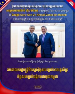 ឧបនាយករដ្ឋមន្ត្រីម៉ាឡេស៊ីគូសបញ្ជាក់ការបន្តគាំទ្រកិច្ចសហប្រតិបត្តិការជាមួយកម្ពុជា នាព្រឹក ថ្ងៃទី១៤ ខែតុលា ឆ្នាំ២០២៥, សម្តេចមហាបវរធិបតី ហ៊ុន ម៉ាណែត នាយករដ្ឋមន្ត្រីនៃព្រះរាជាណាចក្រកម្ពុជា បានអនុញ្ញាតឱ្យ ឯកឧត្តម Dato’ Sri Dr. Ahmad Zahid Hamidi ឧបនាយករដ្ឋមន្ត្រី និងជារដ្ឋមន្ត្រីក្រសួងអភិវឌ្ឍន៍ជនបទ និងតំបន់ នៃប្រទេសម៉ាឡេស៊ី ចូលជួបសម្ដែងការគួរសម និងពិភាក្សាការងារ នៅវិមានសន្ដិភាព។ ក្នុងឱកាសនៃជំនួប, ឯកឧត្តមឧបនាយករដ្ឋមន្ត្រីបានថ្លែងអំណរគុណយ៉ាងជ្រាលជ្រៅចំពោះសម្ដេចបវរធិបតី ដែលបានអនុញ្ញាតឱ្យរូបឯកឧត្តម និងគណៈប្រតិភូ ចូលជួបសម្ដែងការគួរសម និងពិភាក្សាការងារ។ ឯកឧត្តមបានវាយតម្លៃខ្ពស់ ចំពោះការអភិវឌ្ឍរីកចម្រើន នៅកម្ពុជា រួមទាំង អាកាសយានដ្ឋានអន្តរជាតិតេជោ។ ឯកឧត្តមបានបង្ហាញការពេញចិត្តចំពោះទំនាក់ទំនង និងកិច្ចសហប្រតិបត្តិការដ៏ល្អរវាងម៉ាឡេស៊ី និងកម្ពុជា និងបានគូសបញ្ជាក់ការបន្តគាំទ្ររបស់ម៉ាឡេស៊ីក្នុងការពង្រីក និងពង្រឹងកិច្ចសហប្រតិបត្តិការក្នុងវិស័យជាច្រើន រួមមាន៖ វិស័យពាណិជ្ជកម្ម, សេដ្ឋកិច្ច និងការតភ្ជាប់រវាងប្រជាជននិងប្រជាជន។ ជាការឆ្លើយតប, សម្ដេចបវរធិបតីបានសម្ដែងនូវការស្វាគមន៍ចំពោះឯកឧត្តមឧបនាយករដ្ឋមន្ត្រី និងគណៈប្រតិភូ ដែលបានអញ្ជើញបំពេញទស្សនកិច្ចការងារនៅប្រទេសកម្ពុជា ដើម្បីចូលរួមកិច្ចប្រជុំថ្នាក់រដ្ឋមន្ត្រីអាស៊ាន ស្ដីពីការគ្រប់គ្រងគ្រោះមហន្តរាយលើកទី១៣ និងកិច្ចប្រជុំពាក់ព័ន្ធ នៅរាជធានីភ្នំពេញ។ សម្ដេចបវរធិបតីបានសម្តែងការពេញចិត្តចំពោះការរីកចម្រើនគួរឱ្យកត់សម្គាល់នៃទំនាក់ទំនង និងកិច្ចសហប្រតិបត្តិការកម្ពុជា-ម៉ាឡេស៊ី។ សម្តេចបវរធិបតី និងឯកឧត្តមឧបនាយករដ្ឋមន្ត្រី ក៏បានពិភាក្សាក្នុងការជំរុញបន្ថែមទៀតនូវកិច្ចសហប្រតិបត្តិការទ្វេភាគីក្នុងវិស័យសំខាន់ៗ មានជាអាទិ៍៖ ឧស្សាហកម្មហាឡាល់ ដើម្បីបម្រើដល់តម្រូវការនៃប្រជាជនមូស្លីម និងប្រជាជនទូទៅ; វិស័យទេសចរណ៍ រួមទាំង ទេសចរណ៍វេជ្ជសាស្ត្រ; ការអប់រំ និងការបណ្តុះបណ្តាលបច្ចេកទេស និងវិជ្ជាជីវៈ (TVET), កសិកម្ម, ហិរញ្ញវត្ថុ និងធនាគារ ជាដើម។ សម្តេចបវរធិបតីបានលើកទឹកចិត្តស្ថានទូតម៉ាឡេស៊ី នៅភ្នំពេញ បន្តសហការជាមួយក្រសួង-ស្ថាប័នកម្ពុជា ដើម្បីសម្រេចគម្រោងកិច្ចសហប្រតិបត្តិការខាងលើ។ ក្នុងឱកាសខាងលើ សម្តេចបវរធិបតីក៏បានថ្លែងអំណរគុណយ៉ាងជ្រាលជ្រៅជូនចំពោះ ឯកឧត្តម Anwar Ibrahim នាយករដ្ឋមន្ត្រីម៉ាឡេស៊ី ដែលបានសម្របសម្រួលឱ្យមានបទឈប់បាញ់រវាងកម្ពុជានិងថៃ ព្រមទាំង ថ្លែងអំណរគុណជូនចំពោះអគ្គមេបញ្ជាការកងទ័ពម៉ាឡេស៊ី ដែលបានដើរតួនាទីយ៉ាងសកម្មក្នុងការសម្របសម្រួលការតាមដានការអនុវត្តបទឈប់បាញ់ ក៏ដូចជ
