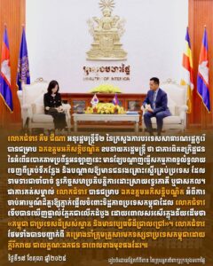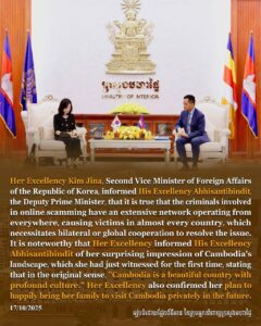 លោកជំទាវ គីម ជីណា អនុរដ្ឋមន្រ្តីទី២ នៃក្រសួងការបរទេសសាធារណរដ្ឋកូរ៉េ បានជម្រាបឯកឧត្តមអភិសន្តិបណ្ឌិត ស សុខា ឧបនាយករដ្ឋមន្រ្តី ថាជាការពិត ឧក្រិដ្ឋជន នៃអំពើឆបោកតាមប្រព័ន្ធអនឡាញនេះ មានខ្សែបណ្ដាញ ធ្វើសកម្មភាពទូលំទូលាយ ចេញពីគ្រប់ទីកន្លែង និងបណ្ដាលឱ្យមានជនរងគ្រោះស្ទើរគ្រប់ប្រទេស ដែលទាមទារជាចាំបាច់ នូវកិច្ចសហប្រតិបត្តិការដោះស្រាយទ្វេរភាគី ឬជាសកល។ ជាការកត់សម្គាល់ លោកជំទាវ បានជម្រាប ឯកឧត្តមអភិសន្តិបណ្ឌិត អំពីការចាប់អារម្មណ៍ដ៏គួរឱ្យភ្ញាក់ផ្អើលចំពោះទិដ្ឋភាពប្រទេសកម្ពុជាដែល លោកជំទាវ ទើបបានឃើញផ្ទាល់ភ្នែកជាលើកដំបូង ដោយពោលសរសើរក្នុងន័យដើមថា «កម្ពុជា ជាប្រទេសដ៏ស្រស់ស្អាត និងមានវប្បធម៌ដ៏ជ្រាលជ្រៅ»។ លោកជំទាវ ថែមទាំងបានបញ្ជាក់ពីគម្រោងនាំក្រុមគ្រួសារ មកទស្សនាប្រទេសកម្ពុជាដោយក្ដីរីករាយ ជាលក្ខណៈឯកជន នាពេលខាងមុខផងដែរ៕ Her Excellency Kim Jina, Second Vice Minister of Foreign Affairs of the Republic of Korea, informed His Excellency Abhisantibindit, the Deputy Prime Minister, that it is true that the criminals involved in online scamming have an extensive network operating from everywhere, causing victims in almost every country, which necessitates bilateral or global cooperation to resolve the issue. It is noteworthy that Her Excellency informed His Excellency Abhisantibindit of her surprising impression of Cambodia’s landscape, which she had just witnessed for the first time, stating that in the original sense, “Cambodia is a beautiful country with profound culture.” Her Excellency also confirmed her plan to happily bring her family to visit Cambodia privately in the future. 17/10/2025 🌐H.E. Abhisantibindit Sar Sokha, Deputy Prime Minister, Minister of Interior 🌐Sar Sokha