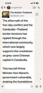 ក្រោយពេលអានកាសែតថៃ The Nation ចុះផ្សាយពីកម្ពុជា ខ្ញុំមានការចាំបាច់ធ្វើការណែនាំពួកគេឲ្យមានវិជ្ជាជីវៈក្នុងសរសេរ។ អ្វីដែលខ្ញុំគួរណែនាំទៅក្រុមកាសែតអស់លោកនោះគឺថា អស់លោកគួរផ្តោតការយកចិត្តទុកដាក់លើសភាពការណ៍ផ្ទៃក្នុងថៃល្អជាង មកគិតពីអនាគតនយោបាយផ្ទៃក្នុងកម្ពុជា។ ខ្ញុំកាន់អំណាចតាំងពីអ្នកកាសែតថៃខ្លះមិនទាន់ចាប់កំណើត ឬនៅដើរស្រាតនៅឡើយ។ ខ្ញុំស្គាល់នូវអ្វីដែលហៅថានយោបាយផ្ទៃក្នុងកម្ពុជា ក្នុងពេលដែលអ្នកកាសែតថៃមួយចំនួនមិនទាំងស្គាល់សភាពការណ៍ថៃខ្លួនឯងផង មកខំសរសេរវាយតម្លៃសភាពការណ៍កម្ពុជា។ ខ្ញុំចង់ប្រាប់លោកអ្នកតាមដានឲ្យបានដិតដល់នូវអ្វីដែលនឹងកើតឡើងក្រោយរដ្ឋាភិបាលអាយុ៤ខែ? ក្រោយរំលាយសភានិងក្រោយការបោះឆ្នោតនាដើមឆ្នាំ២០២៦។ រឿងនៅកម្ពុជាពួកយើងចេះចាត់ចែងកិច្ចការខ្លួនឯងហើយ មិនចាំបាច់សរសេរបង្វែរសាច់រឿងពីថៃ មកកម្ពុជាទេ។ (បើលេងកុំខឹង បើខឹងកុំលេង)៕ After reading several articles published by The Nation about Cambodia, I find it necessary to offer them some guidance on journalistic professionalism. What I wish to advise them is this: they should focus more closely on Thailand’s internal affairs rather than speculating about Cambodia’s political future. I have been in power since before some of these Thai journalists were even born or were still walking around naked. I understand what internal Cambodian politics truly entails, while some of these Thai reporters seem unaware even of the state of their own country’s affairs, yet still attempt to analyse and critique the situation in Cambodia. I would like to tell them to pay close attention to what will unfold after the government reaches four months in office, following the dissolution of parliament and the early elections scheduled for 2026. When it comes to Cambodia, we know how to manage our own affairs. There is no need to twist Thai domestic stories into narratives about Cambodia. (If you’re going to play, don’t get angry and if you’re going to get angry, don’t play.) Connect with Samdech Hun Sen : 🌐Facebook 🌐Telegram 🌐TikTok 🌐Twitter 🌐YouTube 🌐Instagram 🌐Website