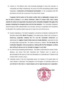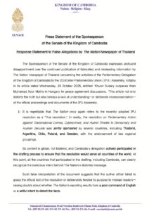 សេចក្តីប្រកាសពត៌មានរបស់អ្នកនាំពាក្យព្រឹទ្ធសភានៃព្រះរាជាណាចក្រកម្ពុជា ឆ្លើយតបទៅនឹងការចោទប្រកាន់មិនពិតរបស់កាសែត The Nation ប្រទេសថៃ ពាក់ព័ន្ធនឹងសកម្មភាពរបស់គណៈប្រតិភូព្រឹទ្ធសភានៃព្រះរាជាណាចក្រកម្ពុជា នៅសន្និបាតសហភាពអន្តរសភា (IPU) លើកទី១៥១ ជាពិសេសនៅក្នុងអត្ថបទរបស់ខ្លួនចុះថ្ងៃពុធ ទី២៩ ខែតុលា ឆ្នាំ២០២៥ ដែល មានចំណងជើងថា «លោកជំទាវ ឃួន សុដារី នាំមុខលោក វ៉ាន់មូហាម៉ាត់ន័រ ម៉ាក់ថា នៅប្រទេសហុងគ្រី សម្រាប់ការពិភាក្សាលើកិច្ចព្រមព្រៀងសន្តិភាព»។ Press Statement of the Spokesperson of the Senate of the Kingdom of Cambodia response Statement to False Allegations by The Nation Newspaper of Thailand concerning the activities of the Parliamentary Delegation of the Kingdom of Cambodia to the 151st Inter-Parliamentary Union (IPU) Assembly, notably in its article dated Wednesday, 29 October 2025, entitled “Khuon Sudary outpaces Wan Muhamad Noor Matha in Hungary for peace agreement discussions. 🙏 សូមចូលទៅកាន់បណ្តាញសង្គមរបស់ព្រឹទ្ធសភា មានដូចខាងក្រោម៖📱 Facebook 📱 TikTok 📱 X (Former Twitter)📱 Instagram📱 YouTube📱 Telegram 🌐 Website