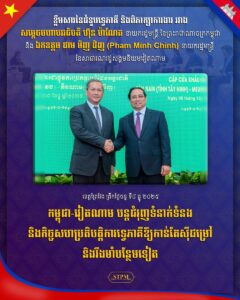 កម្ពុជា-វៀតណាម បន្តជំរុញទំនាក់ទំនង និងកិច្ចសហប្រតិបត្តិការទ្វេភាគីឱ្យកាន់តែស៊ីជម្រៅ និងរឹងមាំបន្ថែមទៀត នាព្រឹកថ្ងៃទី៨ ខែធ្នូ ឆ្នាំ២០២៥, សម្តេចមហាបវរធិបតី ហ៊ុន ម៉ាណែត នាយករដ្ឋមន្ត្រី នៃព្រះរាជាណាចក្រកម្ពុជា និងឯកឧត្តម ផាម មិញជិញ (PHAM Minh Chinh) នាយករដ្ឋមន្រ្តី នៃសាធារណរដ្ឋសង្គមនិយមវៀតណាម បានជួបពិភាក្សាការងារទ្វេភាគី ក្នុងឱកាសនៃការអញ្ជើញជាអធិបតីក្នុងពិធីសម្ពោធដាក់ឱ្យដំណើរការជាផ្លូវការច្រកទ្វារព្រំដែនអន្តរជាតិ ម៉ឺនជ័យ(ខេត្តព្រៃវែងរបស់កម្ពុជា)-តឹនណាម(ខេត្តតៃនិញរបស់វៀតណាម)។ នៅក្នុងជំនួបនេះ, ឯកឧត្តមនាយករដ្ឋមន្រ្តីវៀតណាម បានសម្ដែងនូវក្តីសោមនស្សរីករាយ និងការស្វាគមន៍យ៉ាងកក់ក្ដៅចំពោះវត្តមានដ៏ខ្ពង់ខ្ពស់របស់ សម្ដេចបវរធិបតី និងគណៈប្រតិភូកម្ពុជា។ ឯកឧត្តមបានអបអរសាទរ និងវាយតម្លៃខ្ពស់ចំពោះការសម្ពោធដាក់ឱ្យដំណើរការជាផ្លូវការច្រកទ្វារព្រំដែន ម៉ឺនជ័យ-តឹនណាម ដែលជាសមិទ្ធផលថ្មីឆ្លុះបញ្ចាំងពីភាពរីកចម្រើននៃទំនាក់ទំនង និងកិច្ចសហប្រតិបត្តិការទ្វេភាគី។ ទន្ទឹមនេះ, ឯកឧត្តមបានអបអរសាទរចំពោះការសម្រេចបាននូវសមិទ្ធផលថ្មីៗរបស់កម្ពុជា ក្នុងការធានាបាននូវស្ថិរភាពនយោបាយ និងការអភិវឌ្ឍសង្គម-សេដ្ឋកិច្ច ដែលបានរួមចំណែកលើកកម្ពស់ជីវភាពប្រជាពលរដ្ឋជាលំដាប់។ ឯកឧត្តមបានបង្ហាញនូវជំនឿជឿជាក់យ៉ាងមុតមាំថា ក្រោមការដឹកនាំដ៏ឈ្លាសវៃរបស់ សម្ដេចបវរធិបតី កម្ពុជានឹងបន្តការអភិវឌ្ឍរីកចម្រើនលើគ្រប់វិស័យបន្ថែមទៀត។ ឯកឧត្តមនាយករដ្ឋមន្ត្រីវៀតណាម បានបញ្ជាក់ជាថ្មីនូវការប្ដេជ្ញាចិត្តក្នុងការបន្តជំរុញទំនាក់ទំនង និងកិច្ចសហប្រតិបត្តិការទ្វេភាគី ឱ្យកាន់តែរឹងមាំ និងស៊ីជម្រៅ។ ជាការឆ្លើយតប, សម្ដេចបវរធិបតី បានថ្លែងអំណរគុណចំពោះ ឯកឧត្តមនាយករដ្ឋមន្រ្តីវៀតណាម សម្រាប់ការស្វាគមន៍យ៉ាងកក់ក្តៅ និងបានវាយតម្លៃខ្ពស់ចំពោះលទ្ធផលប្រកបដោយផ្លែផ្កានៃកិច្ចប្រជុំស្តីពីកិច្ចសហប្រតិបត្តិការ និងការអភិវឌ្ឍបណ្តាខេត្តជាប់ព្រំដែនកម្ពុជា-វៀតណាម។ សម្ដេចបវរធិបតី បានលើកទឹកចិត្តឱ្យបណ្ដាខេត្តជាប់ព្រំដែននៃប្រទេសទាំងពីរ បន្តរួមគ្នាកសាងតំបន់ព្រំដែនជាតំបន់សន្តិភាព មិត្តភាព ស្ថិរភាព សហប្រតិបត្តិការ និងការអភិវឌ្ឍ ដើម្បីផលប្រយោជន៍រួម ស្របតាមស្មារតី «ភាពជាអ្នកជិតខាងល្អ មិត្តភាពជាប្រពៃណី កិច្ចសហប្រតិបត្តិការគ្រប់ជ្រុងជ្រោយ និងស្ថិរភាពយូរអង្វែង»។ សម្ដេចបវរធិបតីបានបន្តថា ការសម្ពោធបើកច្រកទ្វារព្រំដែន ម៉ឺនជ័យ-តឹនណាម នាឱកាសនេះ គឺជាសក្ខីភាព ស្ដែងចេញពី ការវិវត្តជាវិជ្ជមាននៃទំនាក់ទំនង និងកិច្ចសហប្រតិបត្តិការទ្វេភាគី។ សម្ដេចបវរធិបតី ក៏បានកោតសរសើរចំពោះការអភិវឌ្ឍលើគ្រ